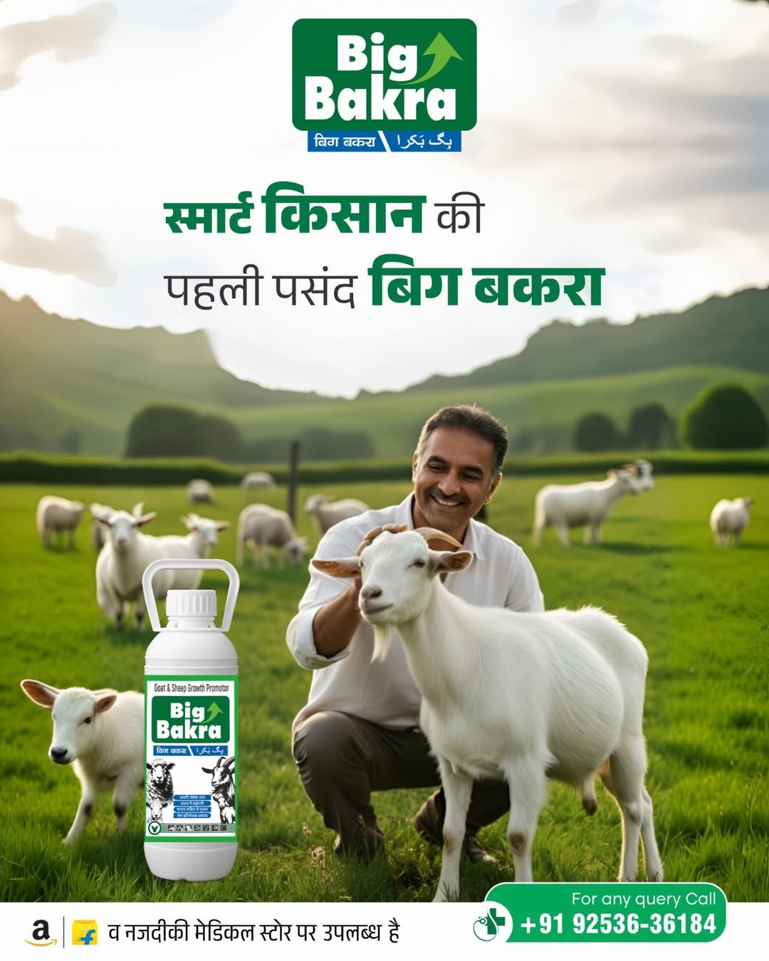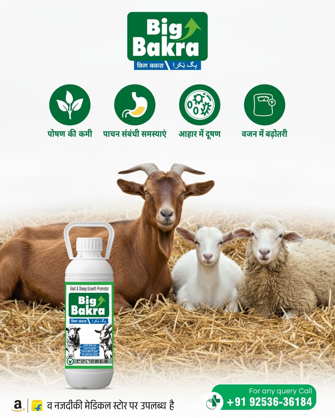 बिग बकरा एक शक्तिशाली Goat & Sheep Growth Promoter है, जो बकरी–भेड़ों की बॉडी ग्रोथ, वजन बढ़ाने और स्वास्थ्य सुधार में बेहद असरदार है। अपने पशुओं को दें तेज़ विकास और मज़बूत ताकत।