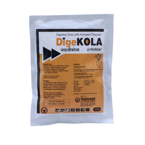 DigeKOLA एक तेज़ असर वाला डाइजेस्टिव टॉनिक है, जो पशुओं में गैस, अपच और दस्त से राहत देकर पाचन बेहतर करता है।